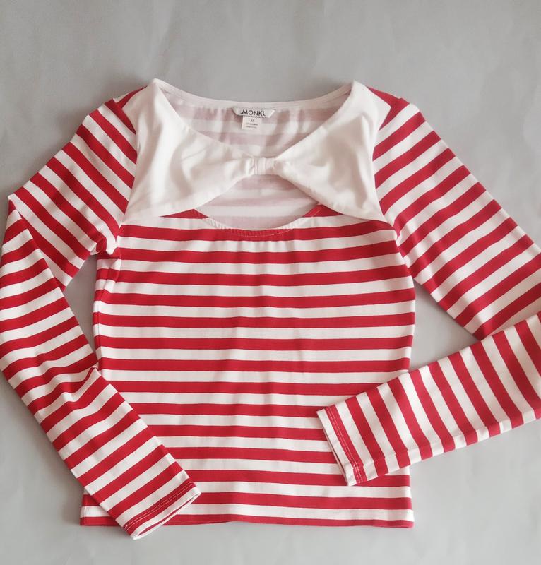 Яркий лонгслив в полоску от Monki в идеальном состоянии в размере XS. Общая длина-48см. ПОГ- 36. Плечи-29. Рукав-60 Ткань тянется в результате эластана.