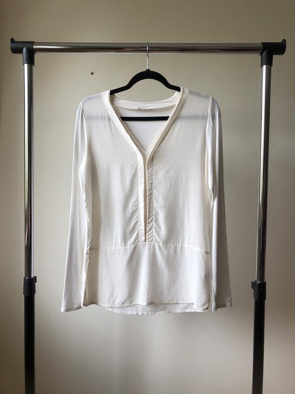 Молочний лонгслів преміального німецького бренду. Стан ідеальний нової речі. Верхня етикетка відсутня, назва бренду зазначена на етикетці зі складом і доглядом. Розмір XS - S. Заміри: ширина по грудях - 49 см, ширина по низу - 49 см, довжина рукава від шиї - 74 см, довжина виробу по спині - 68 см. Склад: тканина комбінована - 100 % шовк, 94 % віскоза, 6 % еластан. Рекомендований догляд: ручне прання і прасування при низькій температурі.