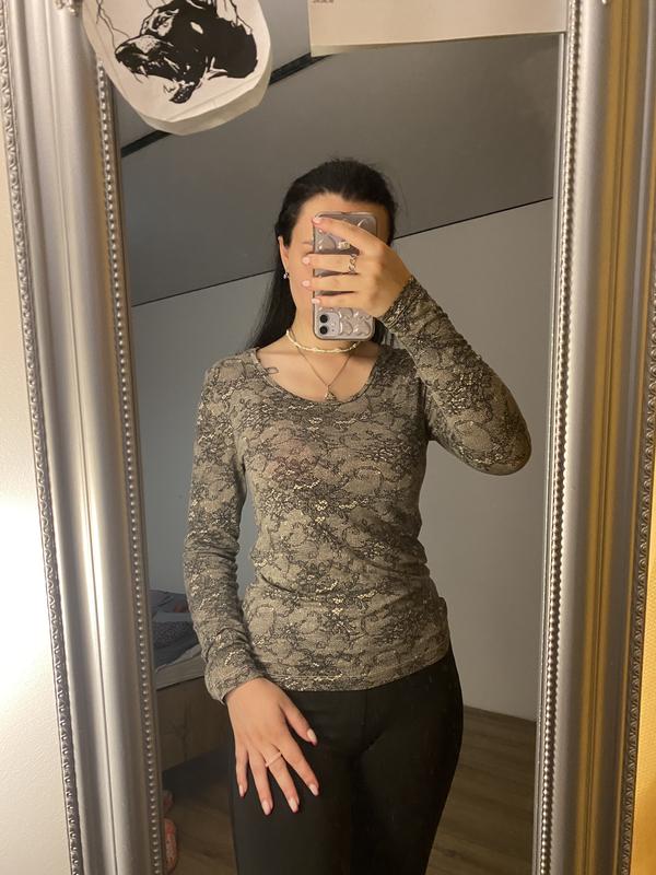 Серая кофточка с принтом-имитацией крупина. Есть дефект в виде дурашки, но при носке не заметно(последняя фото). Также просвечивает, но не существенно.