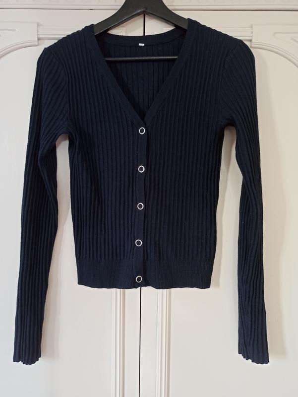 Очень приятная на ощупь кофточка, цвет темно синий. Бирка срезанная, напоминает хлопок с эластаном. Длина 50 см.