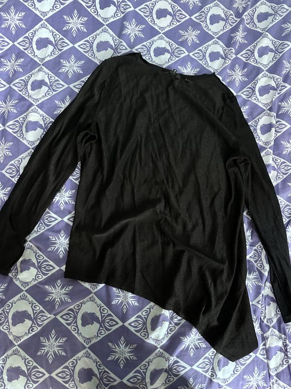 Очень красивая и оригинальная асимметричная кофта, с одной стороны длиннее, чем на другой, немного прозрачная под люрекс, имеет мерцание, насыщенный черный цвет. Размер S-M, состояние идеальное, но есть внутри немного кошлатки(на фото). Возможен торг. Премиальный бренд. Состав сборный, хорошо тянется.