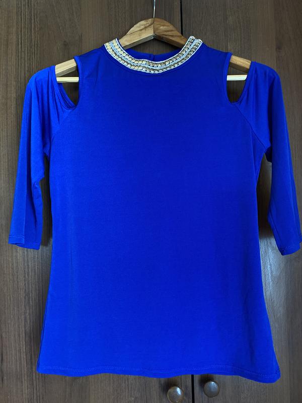 Кофта синього коляру Тканина тонка З відкритими плечима Шия оздоблена камінцями Заді застібається на ґудзики