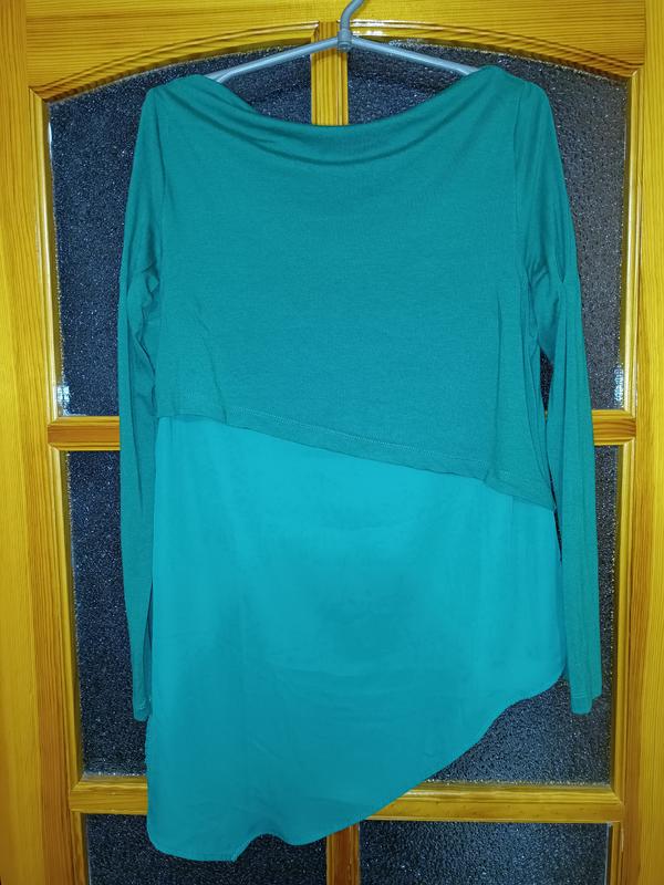 Дуже інтересний лонглслів, асиметричний крой та два види тканини: верх з віскози, а нижня частина не прозора шифонова. Колір на перших двох фото передає некоректно, він такий як на фото, починаючи з третього