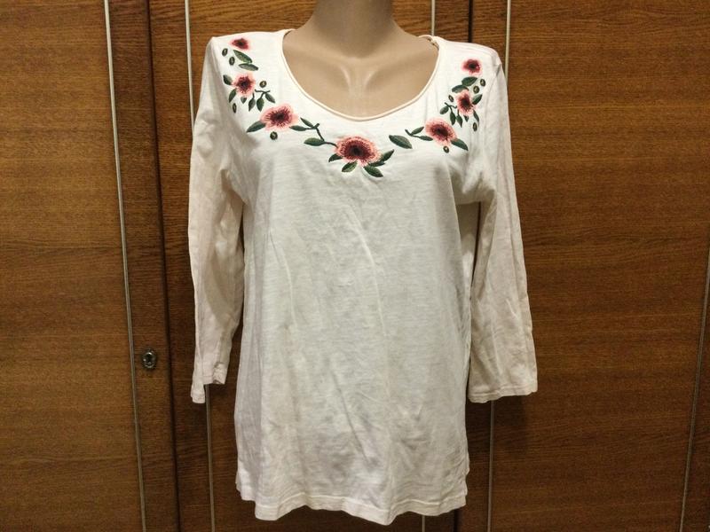 Котоновий лонгслів з вишитими квітами. Можна використати і на день вишиванки. ПОГ - 54 см. Плече- 7 см. Рукав- 42 см. Плечі- 49 (3/4) см. Довжина по спині - 64 см. Спереду на 10 см коротша. Ніжна. Не парить.