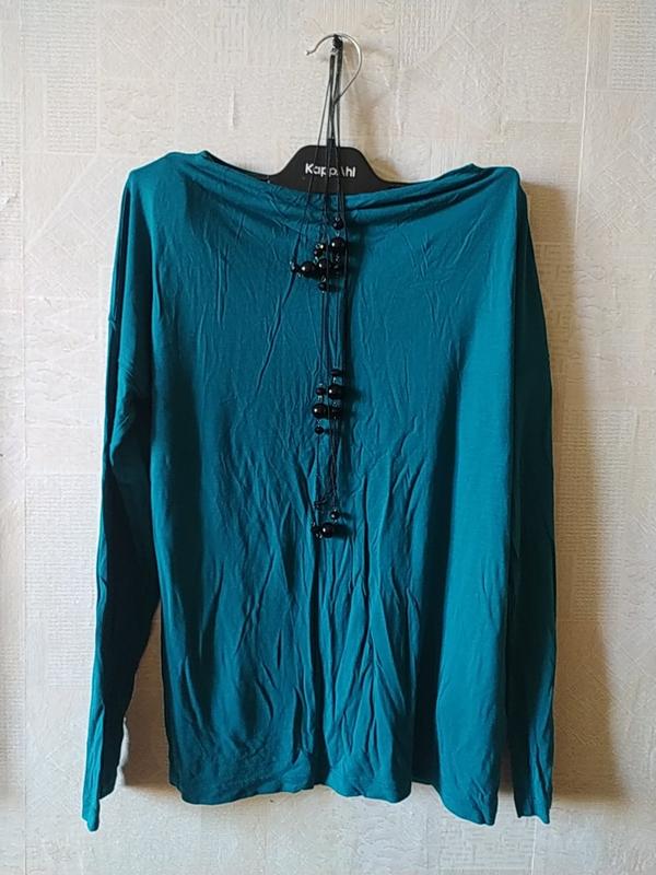 Лонгслів кольору морської хвилі, реально колір як на двух останніх фото ярликів, об'єм по грудям 94-116, по низу 94-110, довжина по центру спинки 58, фасон, як бачите, спущене плече, горловина хомут/ водоспад