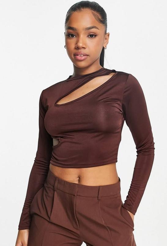 Классный кроп-топ шоколадного цвета, размер XS небольшая S. Замеры ПОГ в свободном состоянии 39 см тянется до 45 см Рукавчик от плеча 61 см Длина 39 см Новый но отсутствует картонная бирочка