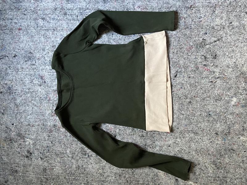 Хорошего зеленого цвета свитшот.очень красиво облегает тело. Состояние 9/10, чуточку растянула резинка снизу. Белое снизу можно от пороты!