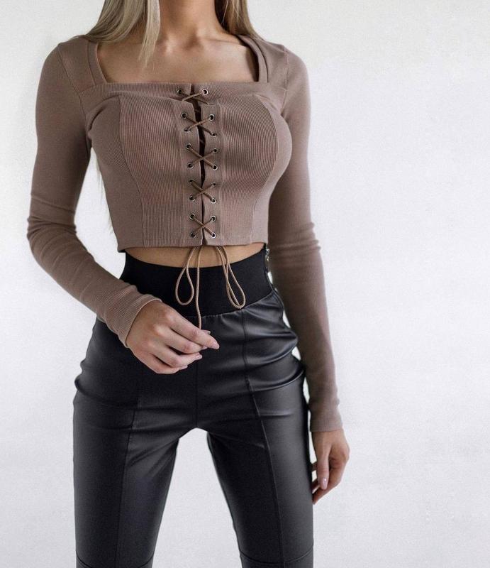 Топ Тканина :рубчик Размеры :42-44;44-46 Цвет: мокко, молоко, черный Корсетный топ на шнуровке из мягкой трикотажной ткани в рубчик.Шнуровка регулируется вручную, что позволяет сделать топ более или менее откровенным😏