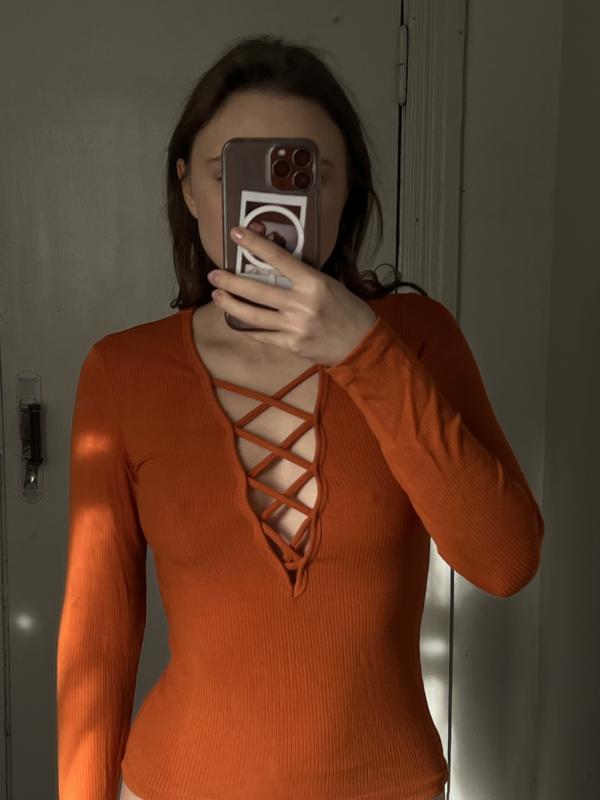 Кофточка в ярко морковном цвете из невероятного декольте, не просвечивает Мои параметры: Грудь: 85см Талия: 62см Бедра: 90см Рост: 162см