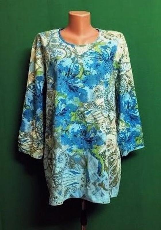 Лонгслив Bexleys (Германия) - 95% Хлопок, 5% Эластан. Ткань средней плотности, хорошо тянется Левая сторона под горловиной украшена синими стразами Основной цвет бирюзовый Размер XXL, по меркам на наш 54-56 размер Ширина у плечах 48 см Пройм 26 см (бицепс 22 см) В груди 66 см У таліі 62 см В стегнах 65,5 см Длина рукава 46 см Длина спинки 72 см Новая в упаковке Торгу нет
