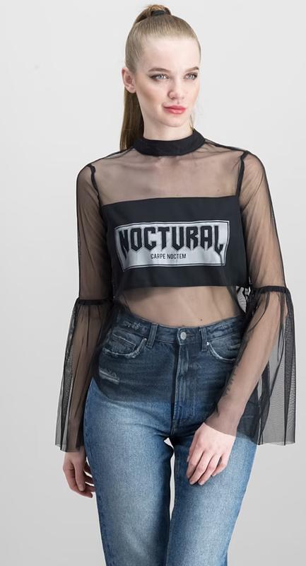 Шикарна чорна блуза з сіточки з принтом в ділянці грудей,рукав каліпсо,крій прямий, можна одягнути під будь-який низ.L,спинка просто сітка. Довжина 58 ПОГ 46 Рукав 62 Безпечна оплата +50 грн до ціни .