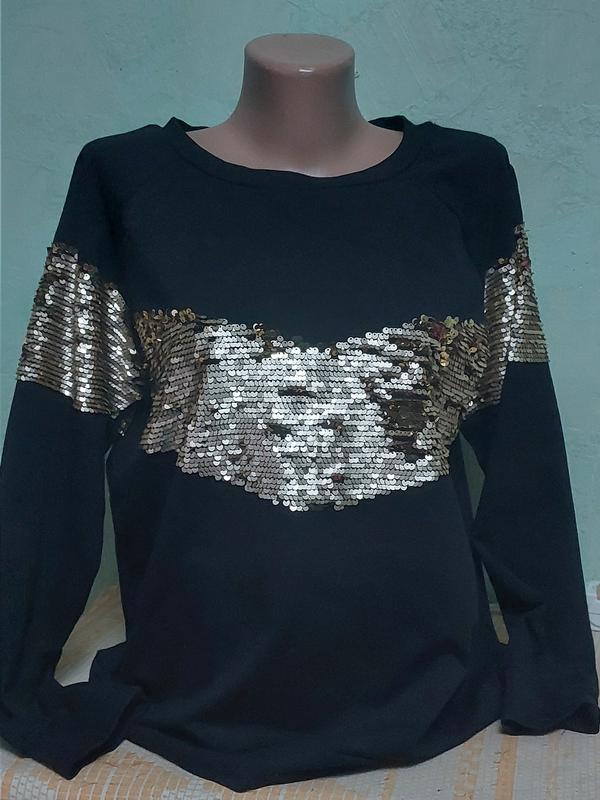 лонгслив кофта в паетках в идеальном состоянии, длина по спинке 61см, ПОГ 52см, длина рукава от воротника 66см. Размер указан М, подойдёт и на Л состав 57 коттон, 43 полиестер