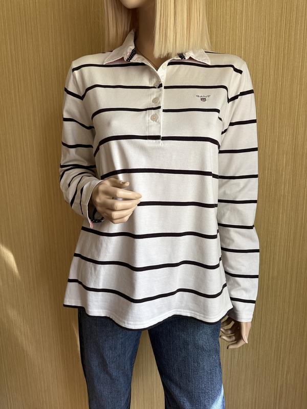 Лонгслив поло Gant. Белый в темно-серую полоску. В составе хлопок. Скорее всего мужской. Хорошо сидит как Овер. Размер указан L.