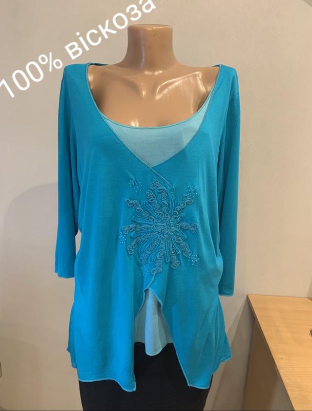 Элегантная двухярусная кофточка в голубых цветах.Спереди украшена аппликацией.Мягкий приятный трикотаж 100% вискоза, качественный бренд.Эффектный, комфортная к телу,гарно растягивается.Пог, ПО низу 55 см, длинна 65-69 см( клинами) 43 см,плечи 44 см