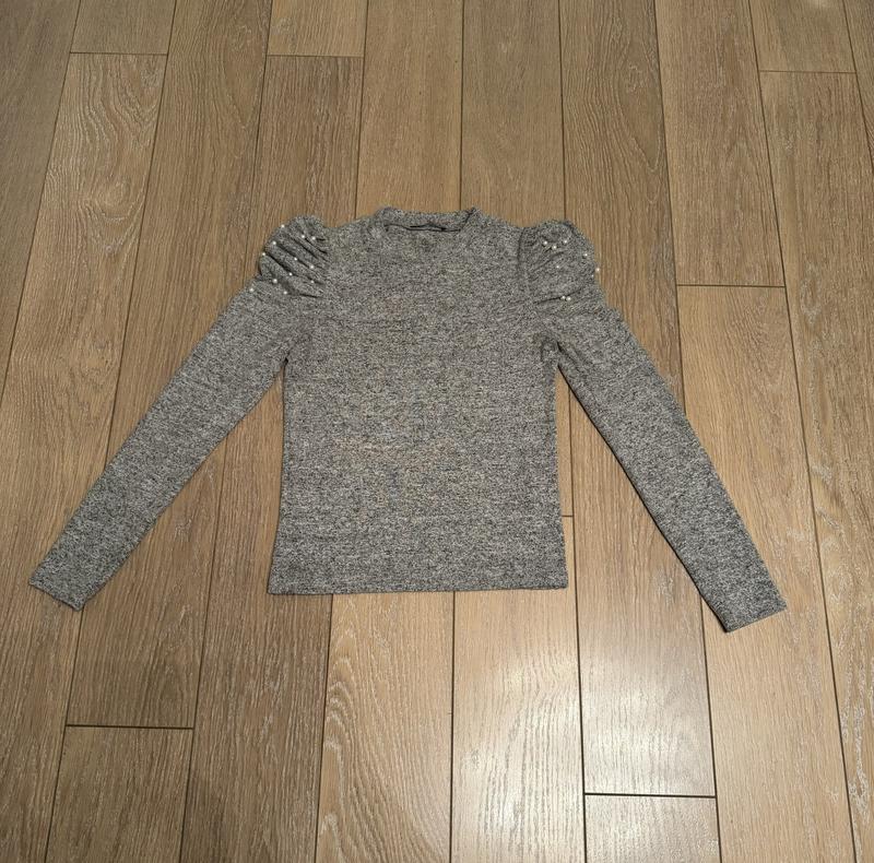 Кофточка/лонгслив, как легкий свитерик, размер S, рукава-фонарики в верхней части, на рукавах жемчужинки пришиты. Состояние отличное, без недостатков.