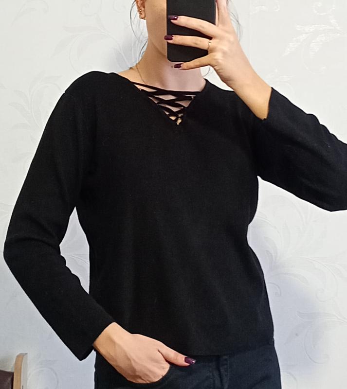 Черная кофточка с интересным элементом в виде завязок на декольте (можно отрегулировать). Кофта теплая и удобная)