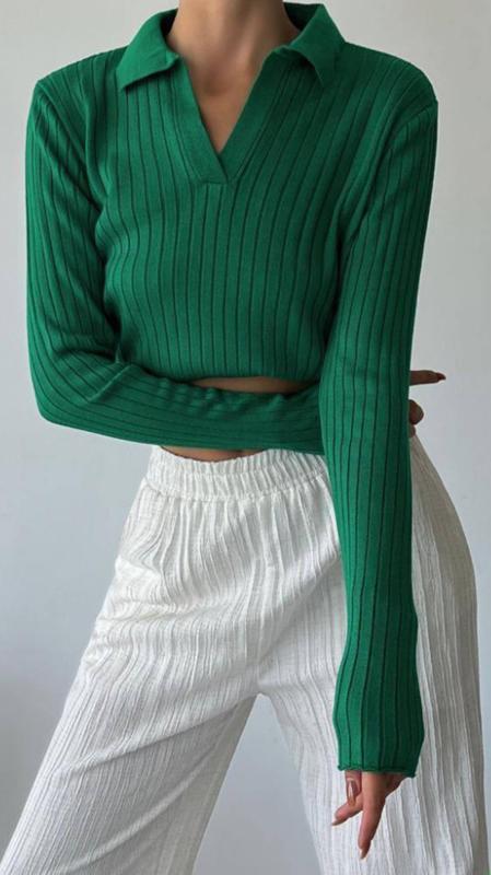 Зеленый детализированный свитер с горловиной поло. Очень красиво садится по фигуре. Ткань приятная к телу.