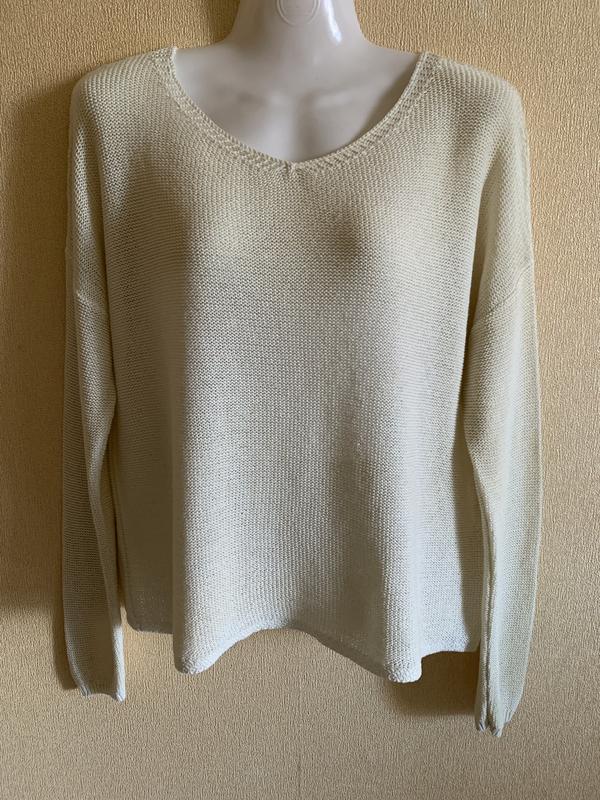 Розмір по бирці М, заміри: довжина 52, НОГ 57, низ 53, плечі спущені — 61, рукав 50, виріз гороловина — 7 см. Состав: 40% line, 35% cotton, 25% nylon.
