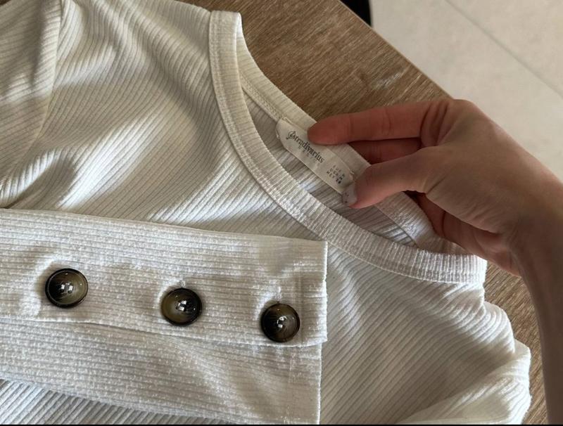 Лонгслив белого цвета в отличном состоянии с длинным рукавом.На рукавах по три пуговицы, размер М