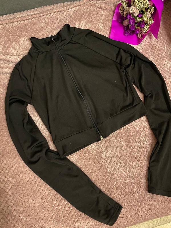 Черный топ с рукавами на молнии. Есть разрез на пальчики.
