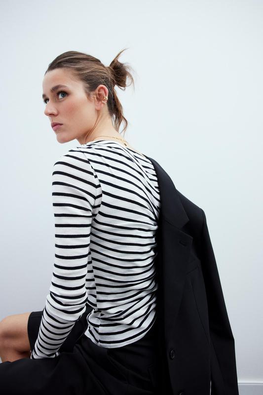 ZARA ИЗЯЩНЫЙ ПОЛОСАТЫЙ АСИММЕТРИЧНЫЙ ТОП С НАКЛАДКОЙ ЛЕГКИЙ - ОБЛЕГАЮЩИЙ КРОХ - ВЫРЕЗ ЛОДОЧКА - СТАНДАРТНАЯ ДЛИНА - ДЛИННЫЕ РУКАВА Топ с вырезом «лодочка» и длинными рукавами. Накладная деталь из той же ткани, сборки. В НАЛИЧИИ М размер СОСТАВ 100% ХЛОПОК