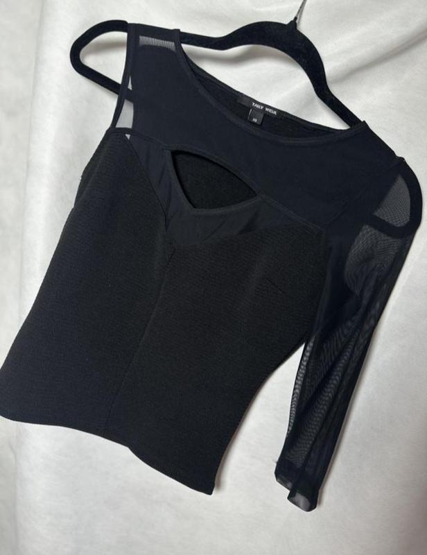 черноушка кофточка с вырезом и с одним рукавом сеточка сочетание двух видов тканей,седует по фигурке состояние новой