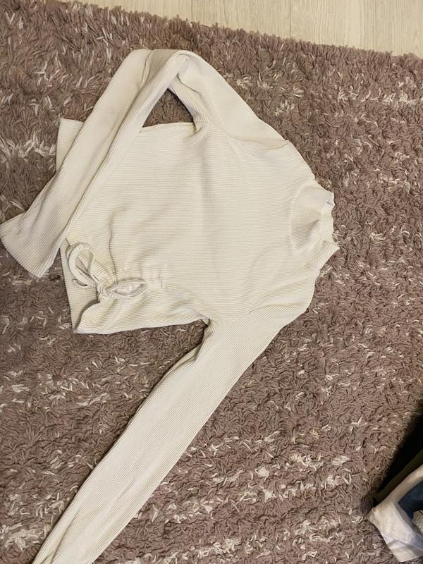Лонгслив в ДУЖЕ красивом состоянии 10/10, по низу завязка «бантик», размер L ( крупномерит) на вид XS-S, хорошо тянется, ткань не просвечивается, ткань плотная в ней не холодно)