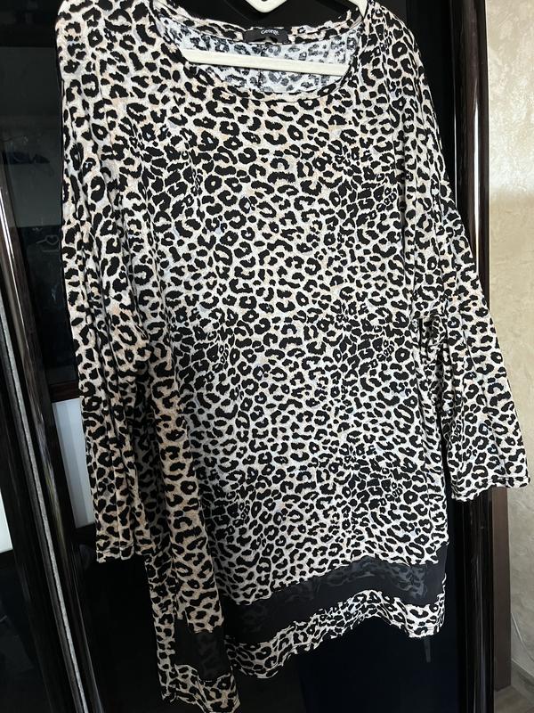 Лонгслив в леопардовый принт, красивый.Пог 70см, по низу 70см, длина 70см, длина рукава 35см(рукав приспущенный)Ткань в виде трикотаж, потайной к телу,вискоза.По низу сеточка.