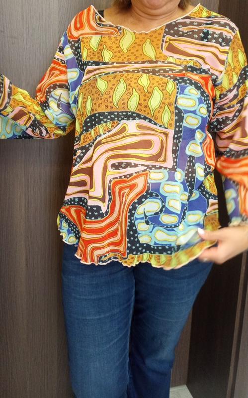 Лонгслив с принтом-евросетка, легкий, ткань полотна, отлично тянется отделка рулик,фасон трапеция, непередаваемая расклешенная к ряду 🌸 Подойдет на размер вот--46--48 -50-52 Замеры ПОГ-61см тягнеться до- 71см плечиное -11см длина рукава -52см длина лонгслива-64см ширина по низу 73см тягнеться до 83см 🌸Состояние новой вещи 👍 без нюансов 😉