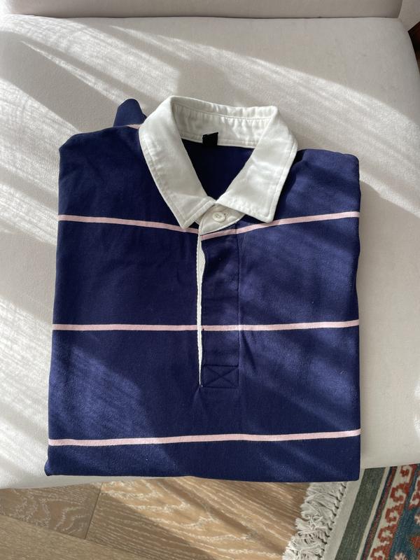 Поло юнікло темно фіолетовий колір з рожевими полосками та білим коміром на ґудзики. На бірці розмір XS. Підійде на S