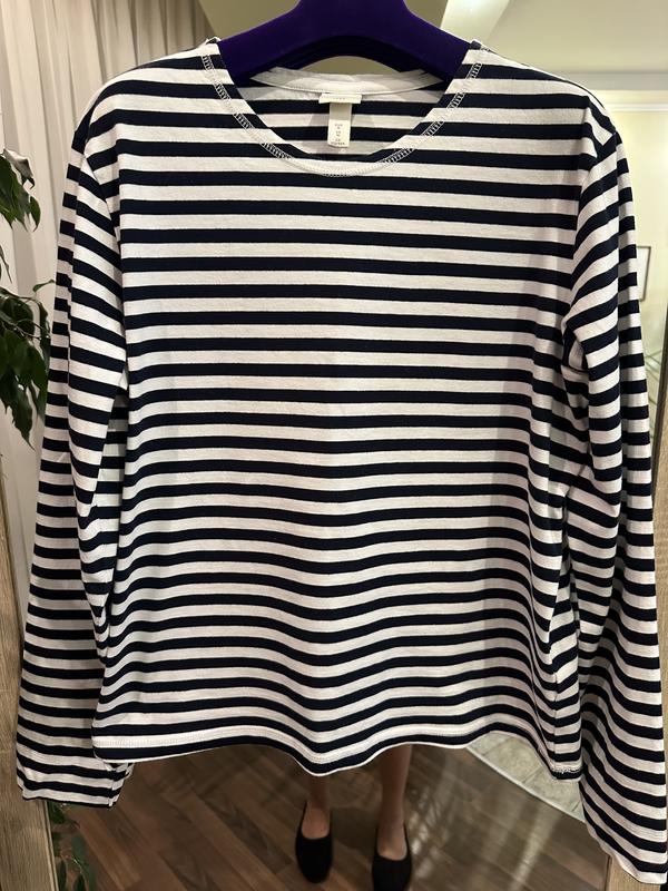 Плотный, непрозрачный 100% хлопок Полоска белая/темно-синяя НОГ 58 Плечи 43 Длина рукава 61 Длина изделия по спине 58