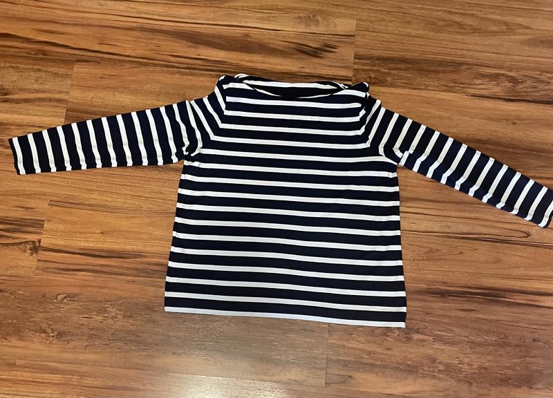 Пог 55 длина 60 Плотная ткань темно синяя в полоску тянется Вырез лодочкой