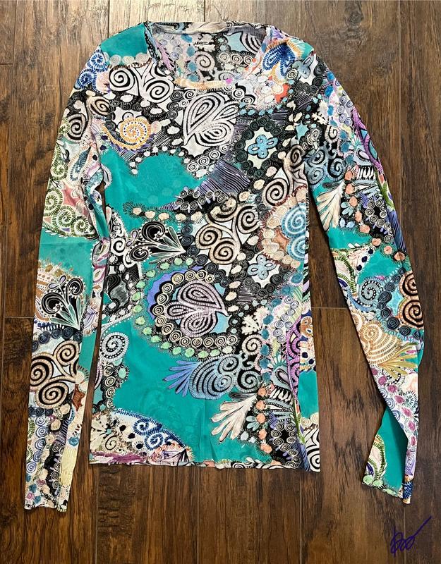 Барвистий лонг-сітка від Marc Cain. Колір м'ятний, морської хвилі. Стан нової речі. В міру яскраві візерунки, стрейчева мʼякенька сітка. Чудово сідає по фігурі, добре тягнеться. Виміри у спокійному стані : Плечі 32см. Груди 35см. Рукав 65см. Довжина 61см.