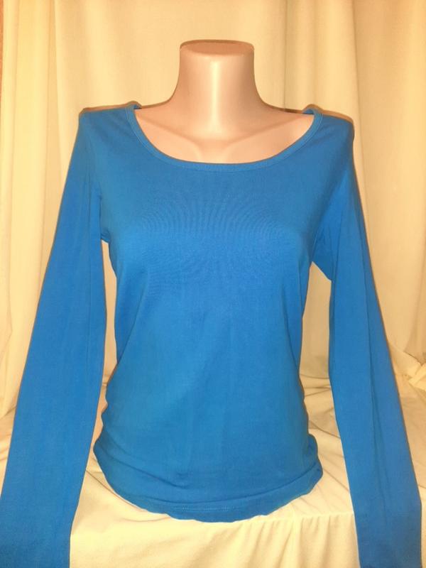 Синий лонгслив, на размер М/L: ПОГ - 43, ПОБ - 43, рукав - 61, плечи - 35, длина - 59см, немного ткань тянется