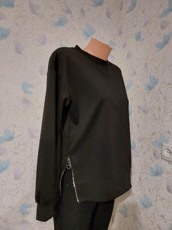 Кофта лонгслив с оригинальными разрезами на молниях по бокам. Цвет в реалии насыщенный черный, на фото получилось немного искаженное изображение цвета. Размер на М. Если заинтересуют точные замеры, пожалуйста пишите. Смотрите также мое другое объявления.