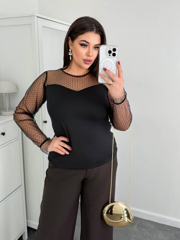 Нарядный лонгслив #1426 Идеальный под дорогой образ для каждой красавицы Размер: 48-52,54-58 Ткань: Микродайвинг приятный к телу, рукава сетка горошек флок Цвет: черный, белый Уход: ручная стирка до 30° Производитель: Украина _________________________ тянется до 20см Замеры 48-52 Ог 112 тянется до 124, длина 70, длина рукава 70 см 54-58 Ог 122 тянется до 134см, длина 72 см, рукав 74см На модели 48-52, рост 170 см Параметри Ог 110 от 85 об 112