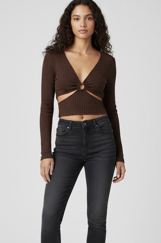 Стильний кроп-топ від H&M лінії Divided у благородному шоколадному кольорі. Особливості: • Розмір: XS • Стан: новий з біркою • Рібрана фактура з V-подібним вирізом • Декоративна деталь з кільцем на грудях • Довгі рукави Тканина: 95% поліестер, 5% еластан - забезпечує комфорт і збереження форми. Заміри (напівобхват): • Груди: 32-41 см • Талія: 29-39 см • Довжина: 41 см • Рукав: 62 см Ідеально підходить для створення трендових образів у стилі casual.