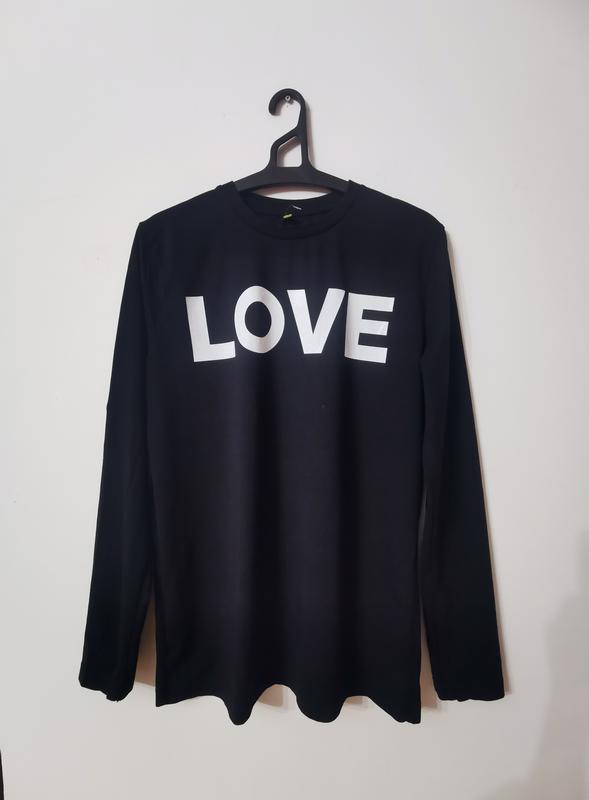 Лонгслив чёрный с белым принтом LOVE, 100 % органик котон. Размер S /M, ширина 48 см. Состояние новой вещи.