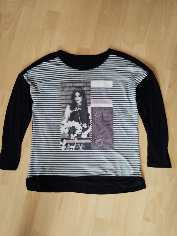 кофта спереди в черно-белую полоску с принтом, поверх нашитая сеточка с тем же принтом. Сзади черная, ткань масло, свободно спадает. длина 64 см ширина по груди 51 см длина рукава 44 см ширина плечей 63 см Подойдет на размер 48/50
