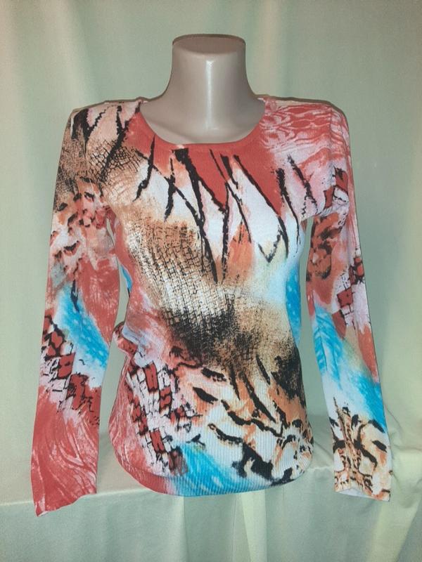 Коттон, вискоза, еластан в составе, состояние идеальное, на s/m: ПОГ - 45см в спокойном состоянии и тянется до 55, рукав - 54см, длина - 56см, ПОТ - 42+ тянется к 52
