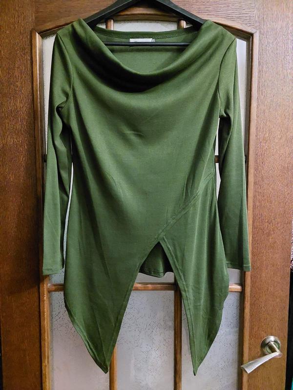 Лонгслів туніка оригінального дизайну GUMUXI. 100% бавовна трикотаж, не носилася. Колір темно зелений, такий як на фото з біркою. Заміри ШП 42, ПОГ 50, ПОТ 46, ПОБ 57, довжина по спинці 65см, довжина рукава 60см.