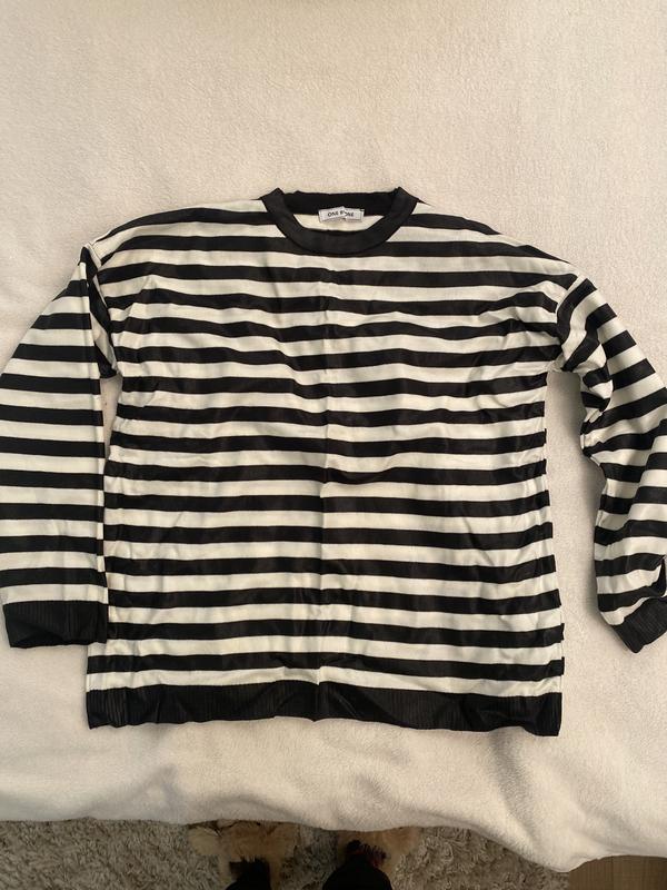 Стильный лонгслив в классическом черно-белом дизайне. Легкий и тонкий, с «пропиткой», которая дает интересный блеск. 100% акрил, размер М. Стан: совершенно новый, ни разу не надевался. (быт в качестве подарка, но не подобрался по размеру)