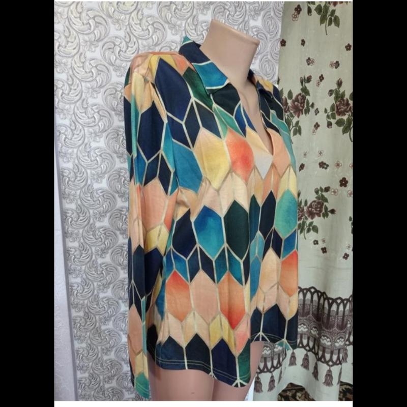 Яркий и красивый реглан с разноцветным принтом.С V-образным вырезом декольте,воротник-стоичка. Бирка с составом отсутствует. Состояние новое, есть бирка. Размер указан L. Ориентируйтесь на замеры. Замеры:ПОГ-53 см;ПОТ-50 см;ПО низа-58 см; плечи-43 см;рукав-57 см;длина-61 см. Последнее фото, как выглядит на человеке. Пересылка.