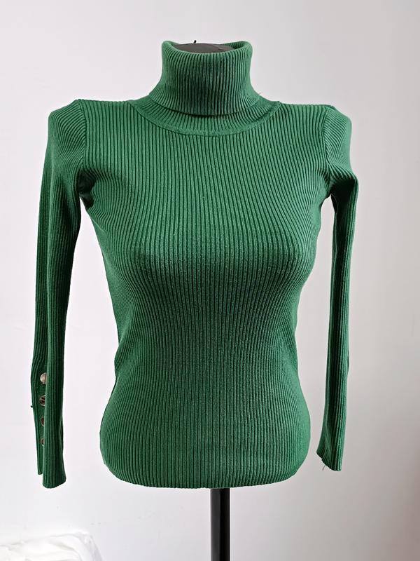 женский гольф в рубчик зеленого цвета Бирки с указанным размером и составом ткани отсутствуют, поэтому ориентируйтесь по замерам плечи 27 см ПОГ 30 см тянется до 50 см ПОТ 28 см низ 30 см длина 52 см длина рукава 48 см ткань очень хорошо тянется гольф в очень хорошем состоянии, но изнутри под рукавчиками, чуточку выцвов цвет, на внешний вид не влияет