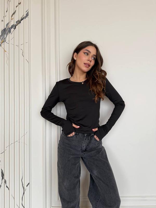 Базовый лонг с эффектным вырезом под пальчик! Ткань: микродайвинг (Турция). Размер: 42-44, 46-48 (ткань очень хорошо тянется). Цвет: черный. Приталенный лонгслив - подчеркнет достоинства фигуры! Лонг, который не захочется снимать! 42-44 Длина - 56 см 46-48 Длина - 59 см