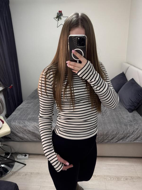 Бело-черный облегающий лонгслив с трикотажного рубчика в полоску. Модель прямого кроя из длинными рукавами и полукруглой горловиной. Лонг декорирован вырезами для пальцев. Размер: М