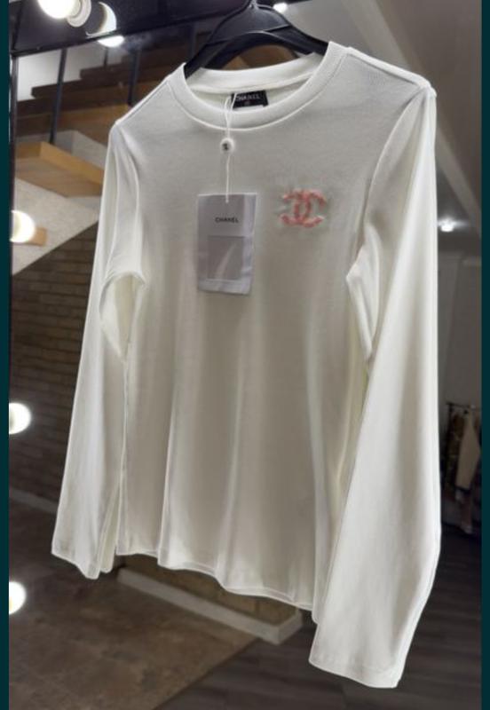 Белый лонгслив с лого бренда на груди Натуральный состав ткань рубчик Качество люкс Размеры с,м