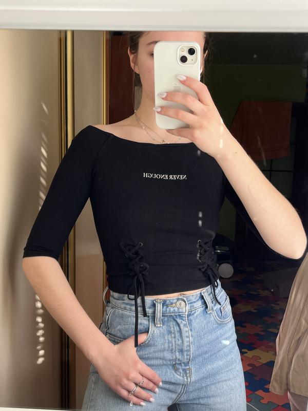 Черный укороченный лонгслив с надписью Замеры по запросу