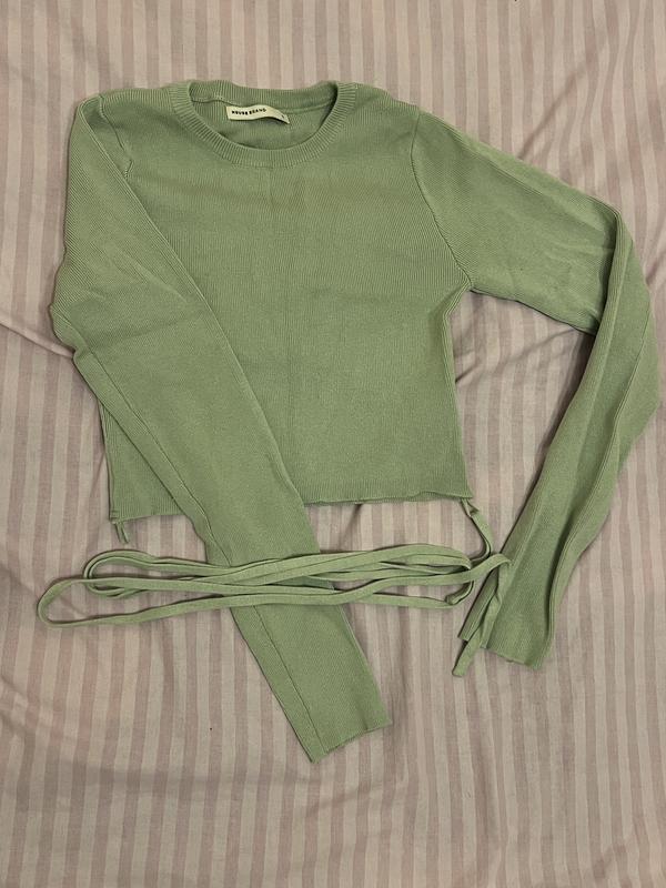 Женская кофта зеленая, в жизни нежно мятный цвет. Размер с, с завязками на животе, но их можно снять