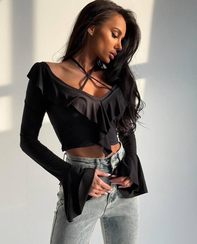 Новинка🔥 Топ Модель 342 ▪Ткань - натуральная вискоза ▪Размеры - 42-46 универсальный ▪Цвета - черный, шоколад и молоко🔗 Это просто must have 💔 Те самые трендовые топы с воланами, выглядят ну очень стильно🤫 Ткань очень эластичная и приятная к телу❤️ Цена 650 грн лон